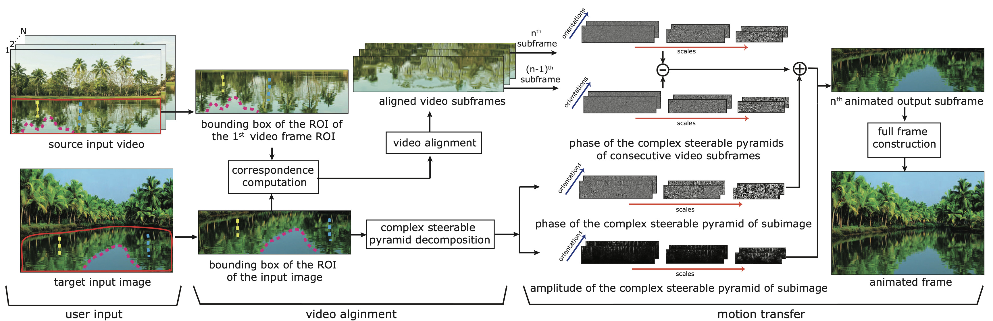 This work introduces a phase-based method for animating still images with subtle stochastic motion, such as rippling water or swaying trees, by transferring motion patterns from example videos of similar scenes. By using phase variations in a complex steerable pyramid rather than optical flow, the approach produces more robust and visually effective animations with fewer artifacts.