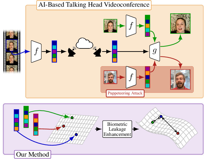 This work addresses real-time puppeteering attacks in AI-based talking-head videoconferencing by detecting identity swaps directly from the transmitted pose-expression latent, without relying on reconstructed video. It introduces a pose-conditioned contrastive encoder that isolates persistent biometric cues from the latent, enabling accurate, real-time detection and strong generalization across models and out-of-distribution scenarios.