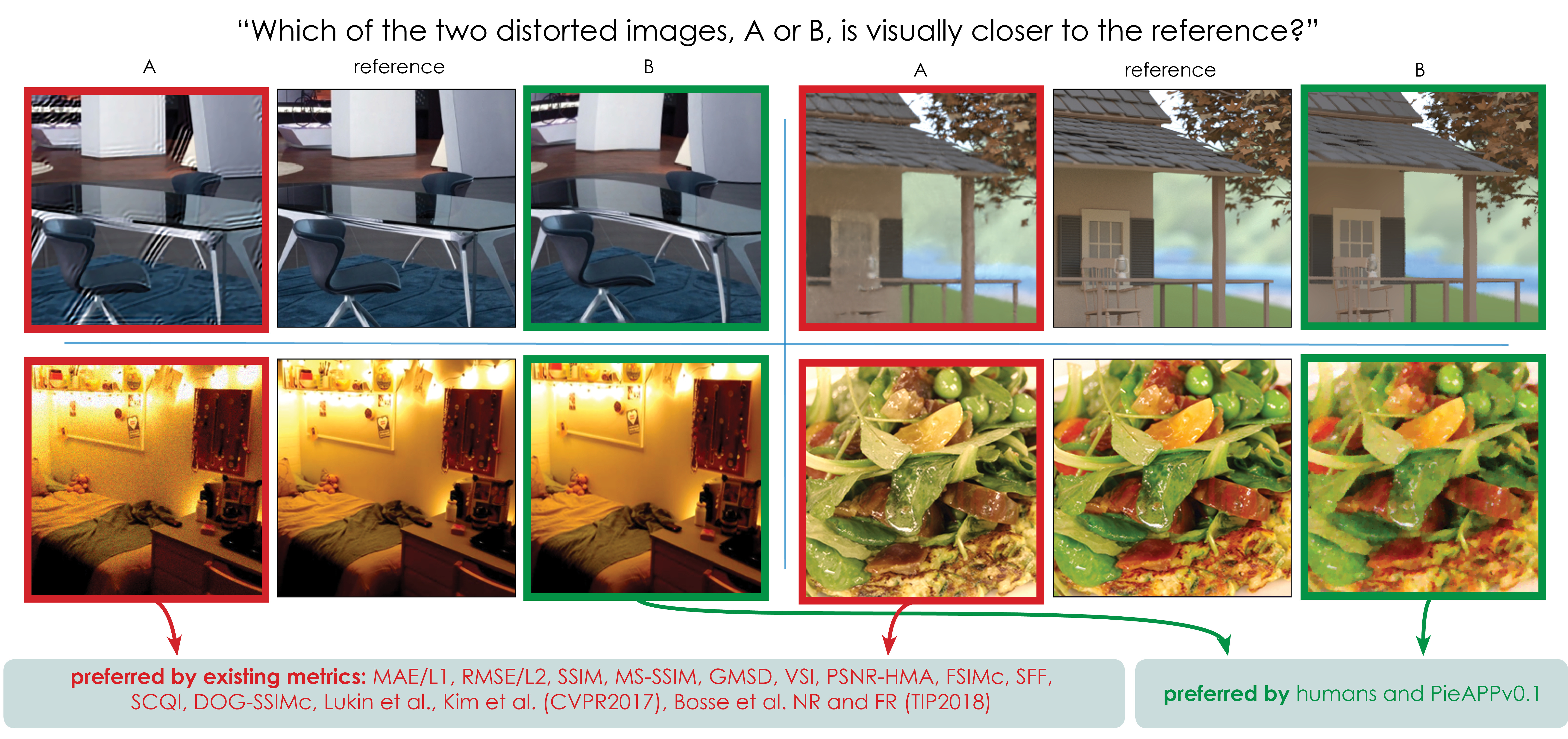 PieAPP is a learning-based perceptual image quality metric that predicts visual differences in a way that closely matches human judgment, without requiring humans to assign explicit error scores. It is trained instead on large-scale pairwise human preferences between distorted images and significantly outperforms prior methods, while also generalizing well to unseen distortions.